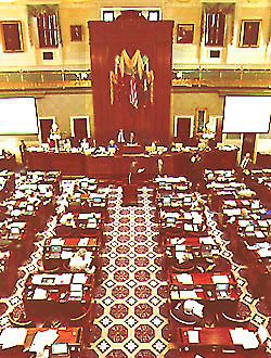 Custom mahogany desktop wedge loudspeakers for each legislator.